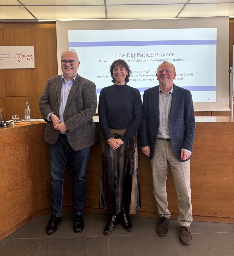 En el decurs de l'acte, que s'ha fet a l'aula de Teleensenyament de l'ETSETB, el professor Ferran Marqués conjuntament amb en Pau López, han impartit la presentació del projecte pel qual han estat galardonats 'The DigiPatICS Project' (Projecte d'optimització del diagnòstic anatomopatòleg en xarxa als hospitals de l’ICS a través de la digitalització i eines d'intel·ligència artificial) que ha estat desenvolupat al Grup de Processat d'Imatge.